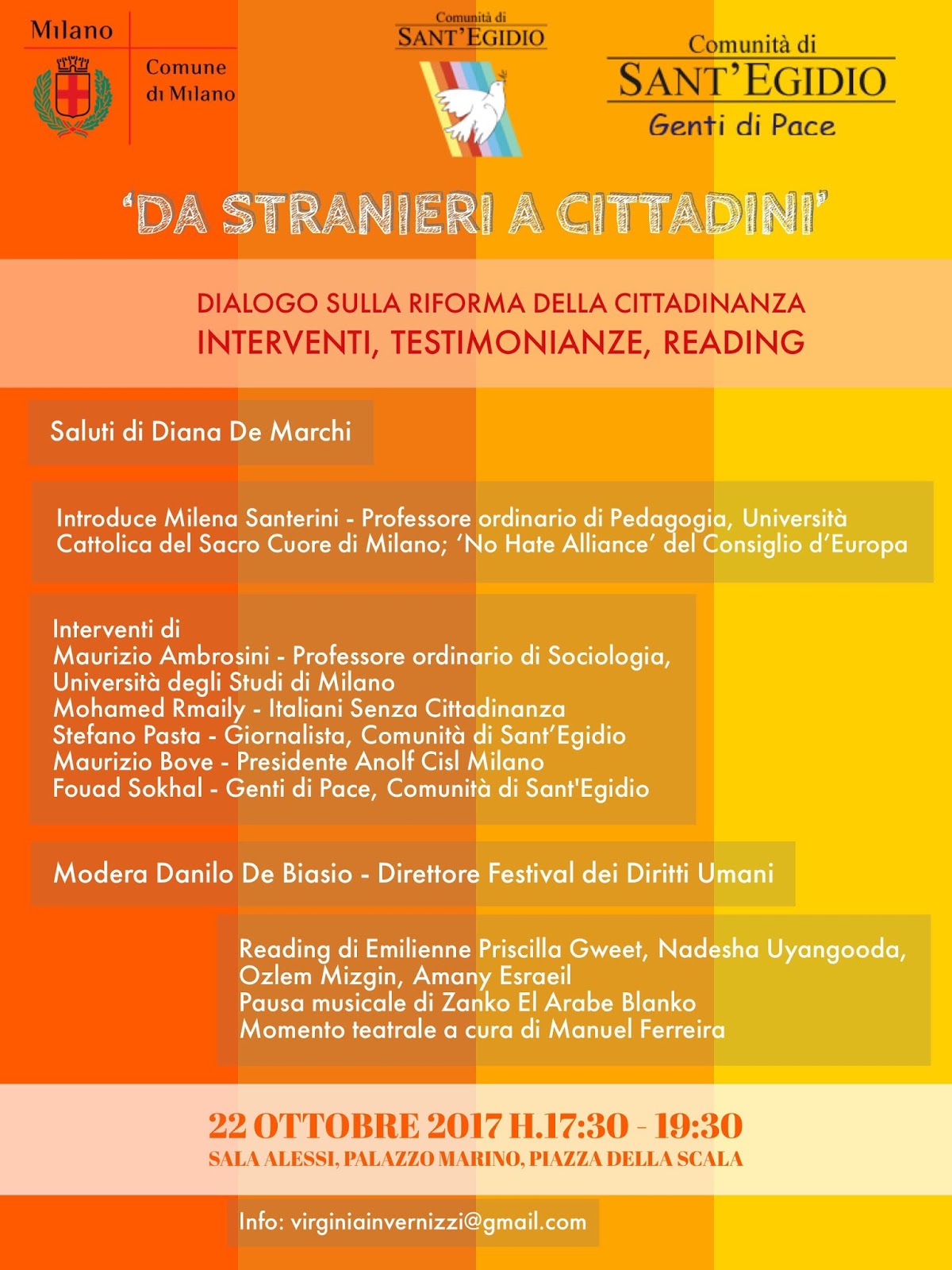 siamo lieti di invitarvi al Convegno “Da stranieri a cittadini. Dialogo sulla riforma della cittadinanza” , organizzato in collaborazione con la Comunità di Sant’Egidio e con Genti di Pace.